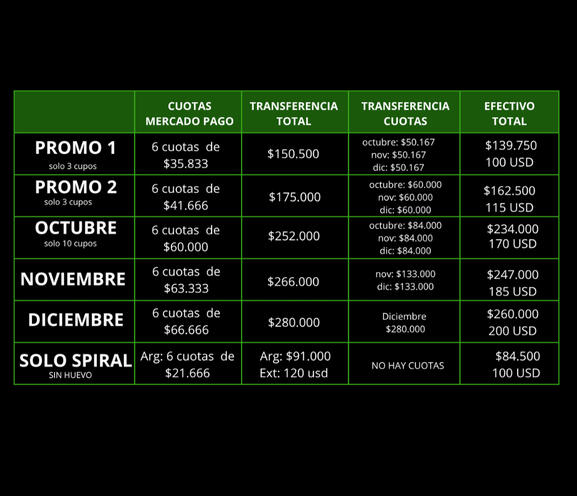 Haciendo click en el LINK te lleva a la TIENDA WEB en donde podrás elegir distintos métodos de pago con cuotas o descuentos, elegir envío o retirarlo.Si sos de EXTERIOR podes realizar el Spiral solo abonando el curso y te guiamos en comprar tu huevito en el exterior.Por la TIENDA también podes contactarnos al WhatsApp y te ayudamos a realizar la reserva de tu cupo y tu huevo